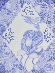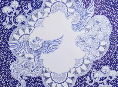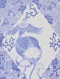 This is one of my pieces that are inspired by Chinese Blue and White ceramics and is structured similarly to “Red” (2017), featuring a triumphant phoenix rising from their struggle and reaching new heights. “Emerging” represents the immense joy and relief I felt in mid June 2023, when I finally made it to the tail end of struggling with what turned out to be an 8 month long kidney infection that wrecked my life. A tendril of the struggle still tries to cling on in the form of a vine wrapped around the central bird and all the consequences of that period of struggle, but the lotuses are a reminder that beauty emerges from mud and the cicadas symbolize how rebirth requires great patience.