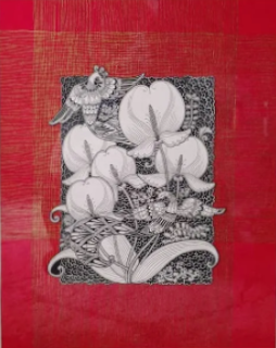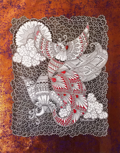 A bird drawn in black ink in a detailed, decorative style against an ornate background drawn in red ink