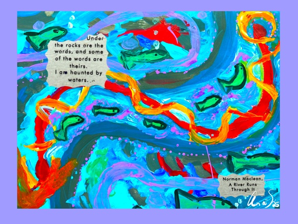 This piece is inspired by my late little brother Noah, and his love of fishing. He started fishing when he was 3yrs old, and I had the honor of being by his side, as he fished 17 out of his 20 years. He loved the film, “ A River Runs Through It.” So much so that when he passed, my mom chose a quote from the film to add to bookmarks we made of him. Noah directly fostered my love of reading because whenever he was fishing, I was alongside him, reading.I scattered his ashes over one of his favorite rivers, and I believe his essence is in every river he fished in – as a river runs through it.